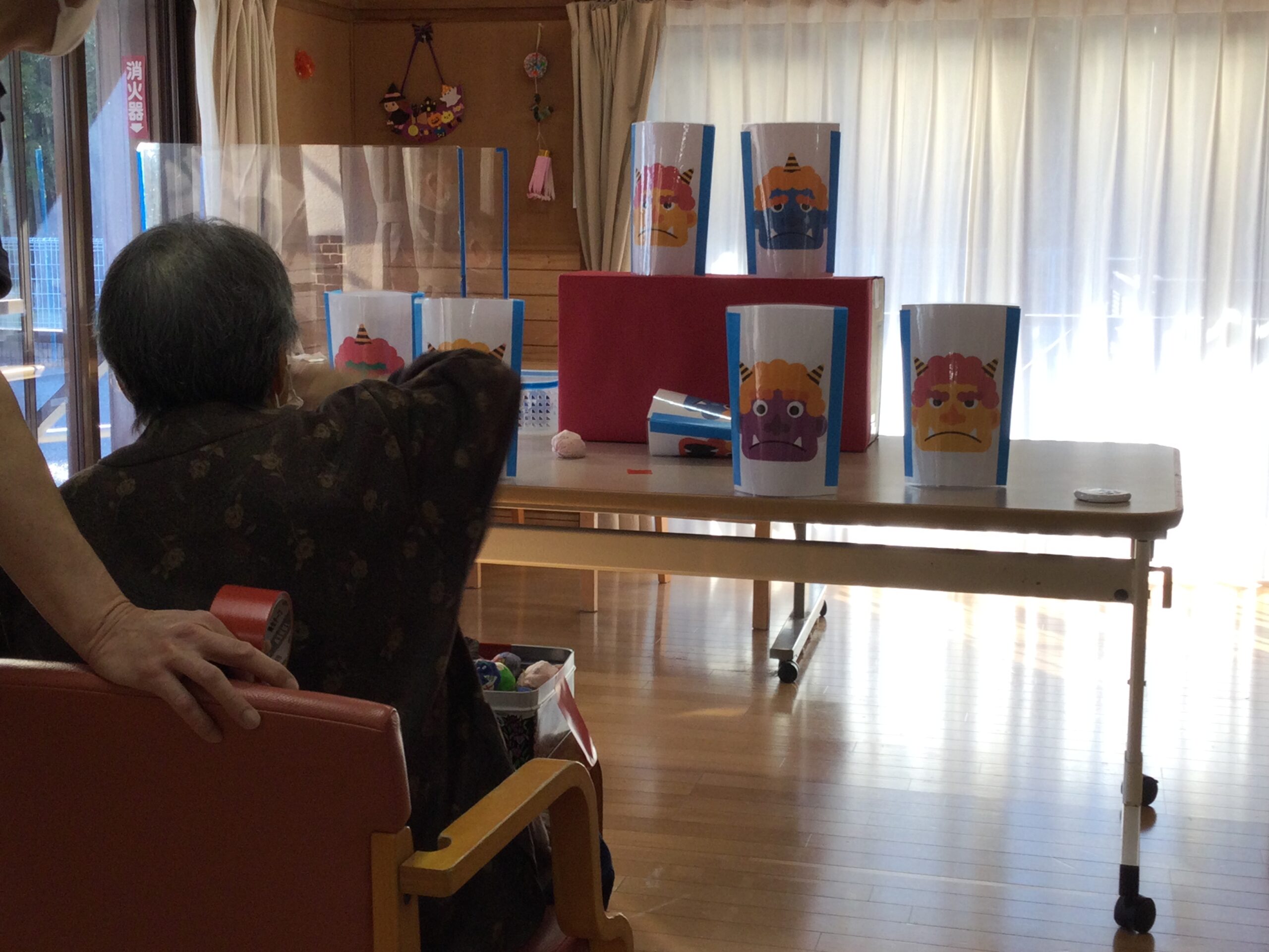 豆の代わりにお手玉を力いっぱい投げ、無病息災を願いました。
